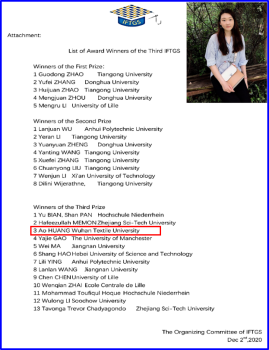 11月29日, “第三届研究生国际纺织论坛(IFTGS)线上会议”在天津工业大学如期举行。来自全球近30个国家和地区的500余名专家学者和研究生参加。本届论坛的主题是“创造美丽、健康、精彩的纺织工业”,分为专家主论坛和“纺织复合材料”“功能性纺织纤维与纺织品”“电子纺织品与智能可穿戴设备”三个研究生分论坛。会议遴选来自英国曼彻斯特大学、法国里尔大学、法国国立纺织工艺公司、里尔中央理工公司、德国下莱茵应用技术大学、澳大利亚弗林德斯大学、突尼斯莫纳斯特尔大学、安徽工程大学、大连工业大学、东华大学、河北科技大学、江南大学、苏州大学、永利官网、西安工程大学、浙江理工大学和天津工业大学共53名研究生作了学术汇报。参与汇报的研究生主要为博士生,公司二年级硕士研究生黄傲同学参与了本次会议,她的学术报告引起了与会人员的很大兴趣,并荣获得三等奖好成绩,展现了公司研究生的良好风采,这是公司研究生首次获此奖项。