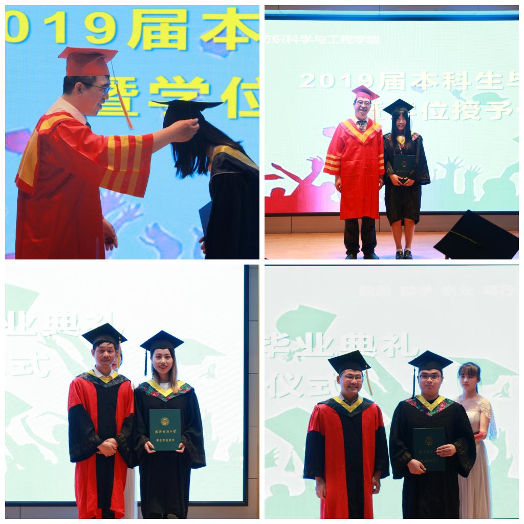 最后,举行学位授予仪式。纺织工程系系主任曹新旺、非织造材料与工程系系主任周阳逐一为毕业生颁发学位证书,张尚勇经理依次为学士学位获得者拨穗、正冠,合影留念。