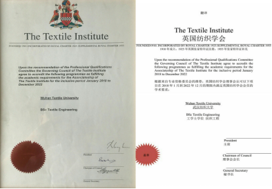 此前,公司纺织工程专业已获得英国纺织学会(The Textile Institute)工学学士学位认证。