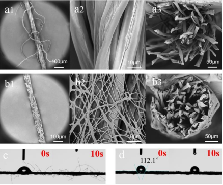C纱、NC纱结构如图2(a)、图2(b)所示。C纱亲水吸湿性好;NC纱表呈三维网状结构,孔隙率高、比表面积大,具有拒水功能,如图2(d)所示。