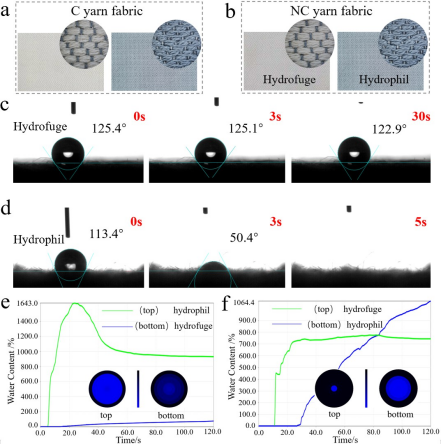 图3(a)和(b)表示C和NC纱线与蓝色棉纱交织形成双面织物。显然,NC纱织物表面更光洁。NC纱线织物两面具有相反的透水性能有:液压分离(N侧)和亲水(O侧),MMT测试结果如图3(e)和(f)所示。该研究结果以“Qualified nano-composite yarn for hydrophobic fabric via online nano- and micron-fiber composite spinning”为题,发表在Textile Research Journal(DOI: 10.1177/00405175221124357)期刊上。论文的第一作者为永利官网研究生齐硕,硕士生俆傲、刘佳鑫协作完成,通讯作者为永利官网徐卫林院士团队的夏治刚教授。该研究得到了湖北省科学技术厅、武汉市科学技术局基础研究等项目的支持。