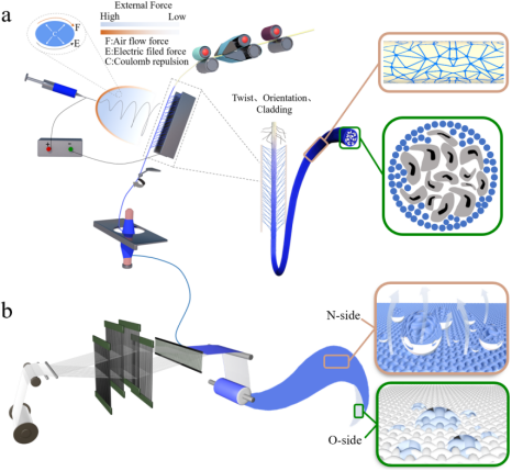 传统纺纱用纤维微米级的直径限制了纱线加捻纤维之间的极限粘聚力,静电纺丝得到的纳米纤维具有较大的比表面积、较高的表面能和大量的活性中心,然而,纳米纤维直径超细、绝对强度低、耐磨性差,限制了纳米纤维的工业化纺织加工应用。近日永利官网“纤维及其集合体先进加工技术课题组”,避开了纺织加工中的梳理、牵拉受力损伤纳米纤维,充分发挥微米纤维和纳米纤维的优势、弥补劣势,提出了在须条捻合成纱区中,直接喷射纳米纤维,裹覆缠绕在微米纤维纱条上,形成微/纳纤维高品质复合纺纱方法(图1,已授权多项专利保护),并应际华三五四二纺织有限公司要求,将聚氨酯纳米纤维在线缠绕裹覆在棉纤维上,生产了芯鞘结构纳微复合纱(NC yarn),与相应的普通棉纱(C yarn)相比,复合纱鞘被高度定向的纳米纤维包裹,获得超光洁性能和疏水功能,成形品质显著提升:纱强提升5.53%、条干不匀降低30.36%。本研究为实现纳米纤维和超细纤维在纱线形成区的在线有序结合,为功能性织物设备(如滤水器和收集器)生产高质量的疏水纱线开辟了一条新途径。