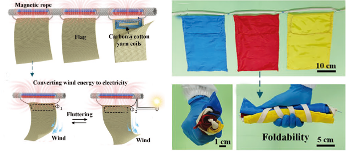 图2. 柔性磁电风力发电旗帜的发电原理和便携性