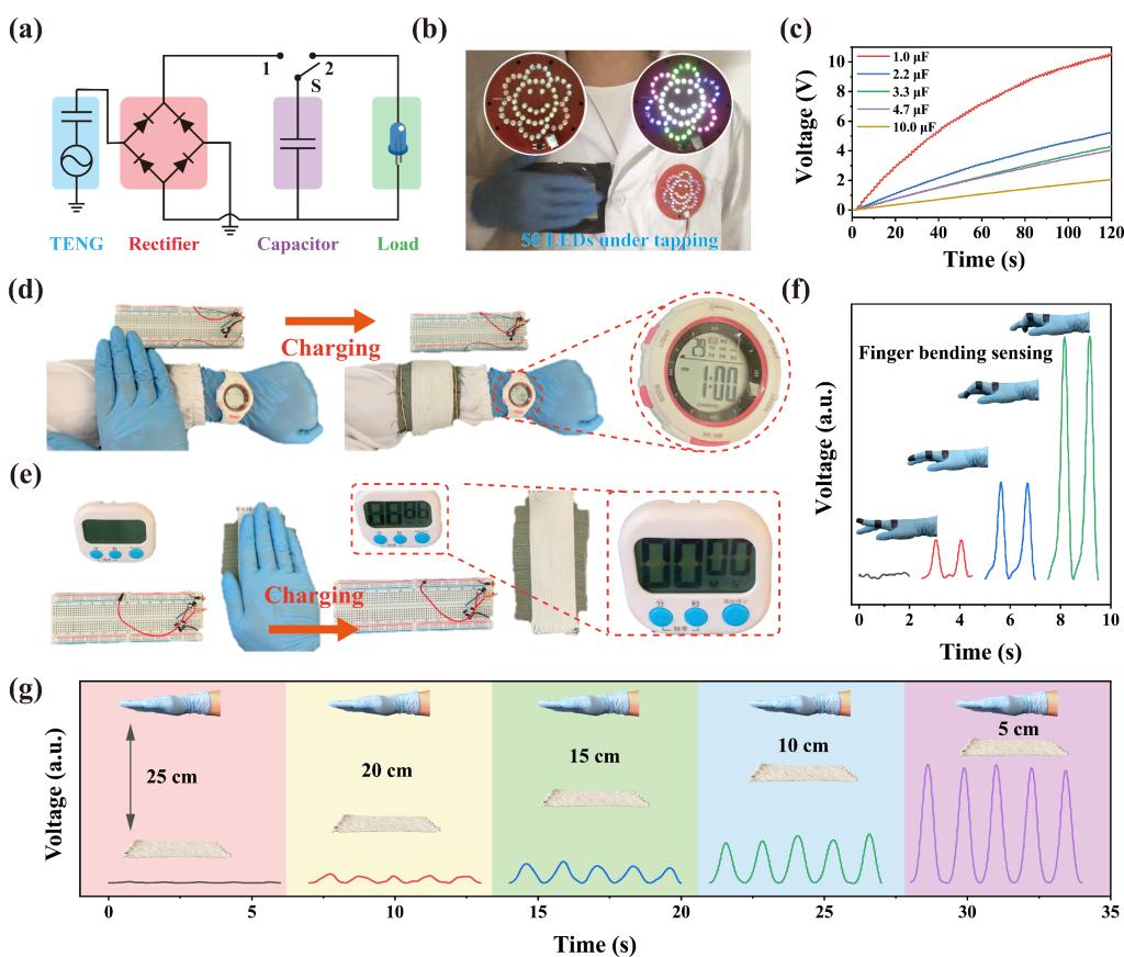 采用该纱线传感器制备的织物,表现出优异的摩擦电学性能:50 V开路电压VOC、500 nA短路电流ISC和100 nC短路转移电荷QSC。该纱线及织物实现了能量传输、无接触传感,自供能传感并可有效驱动各种电子设备(图4)。