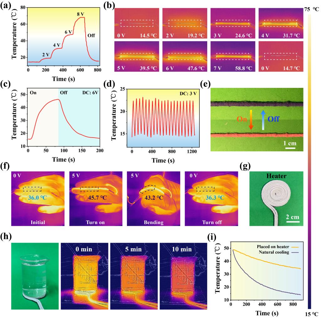 此外,由于液态金属的高导电性,多功能纱线传感器的电热响应快速,展现出优异的电热致变色和保温性(图5),在智能纺织品、柔性可穿戴设备和布态人机界面等方面有巨大潜力。