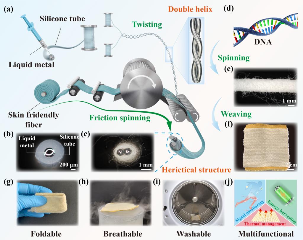 柔性纱线传感器是智能可穿戴电子产品的关键组件。然而,大规模制造具有多功能和穿着舒适性的高性能纱线传感器仍然是一个挑战。近期,永利官网徐卫林院士团队的夏治刚教授,携手中科院纳米能源所董凯研究员、华中科技大学苏彬教授,受DNA双螺旋稳定结构的启发,通过摩擦包芯复合的液流纺纱技术(图1),开发了一种基于液态金属的双螺旋包芯纱,实现了柔性纱线传感器的大量生产,用于人体运动监测、能量收集和热管理。