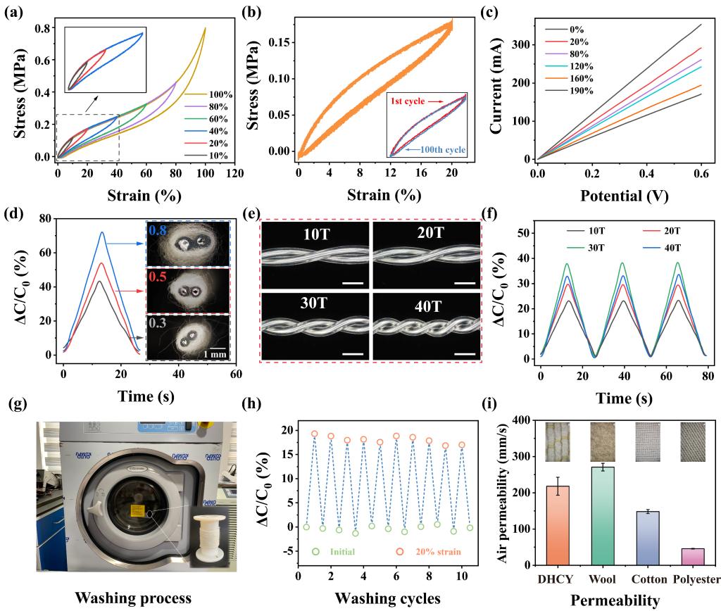 图2. 多功能纱线传感器的机械性能和耐水洗及透气性能