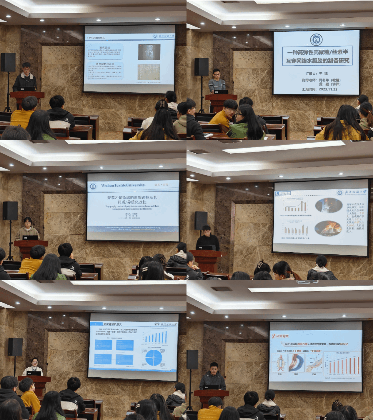 论坛上,赵华旺、张金芹、陈定伟、林雪晴、于猛、辛翔鹏六位同学依次介绍了自己的研究课题和目前取得的研究进展,并分享了自己的科研经验。主讲同学的研究课题涵盖了小口径人造血管、多色荧光微球、高弹性阻燃纱线、聚苯乙烯微球、壳聚糖/丝素半互穿网络水凝胶、机织/针织混编织物等领域,契合了“纺织新材料及绿色加工”主题,代表了公司最新研究进展,营造了良好的学术氛围。