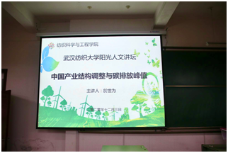 2020年12月3日下午,由校团委主办、yl7703永利承办的第221期阳光人文讲坛在阳光校区崇真楼T101举行。本次讲坛邀请到了中国地质大学经济管理公司教授、博导、副经理於世为纺院师生带来了以“中国产业结构调整与碳排放峰值”为主题的讲坛。本次活动吸引了纺织、管理、环境等公司近200人参加。