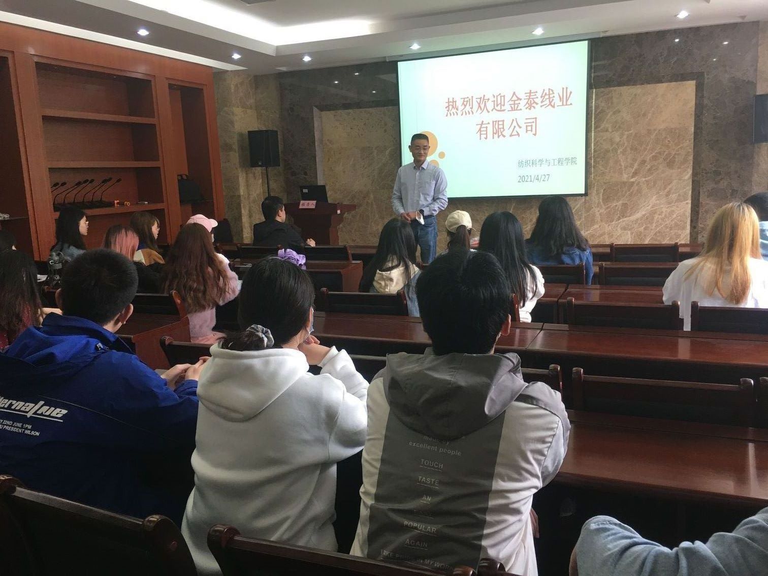 潘总经理首先向同学们详细介绍了纺纱行业的发展现状,并结合自身经验,深入分析了纺纱加工工艺和流程的未来发展和创新方向,为同学们开拓了视野,增长了见识。同时,潘总经理从企业理念、创新创造、合作共赢三个方面介绍了公司风采,展示了企业实力,使大家对个人、企业、社会这三层价值有了新的认识,开始思考和聚焦自己的未来。