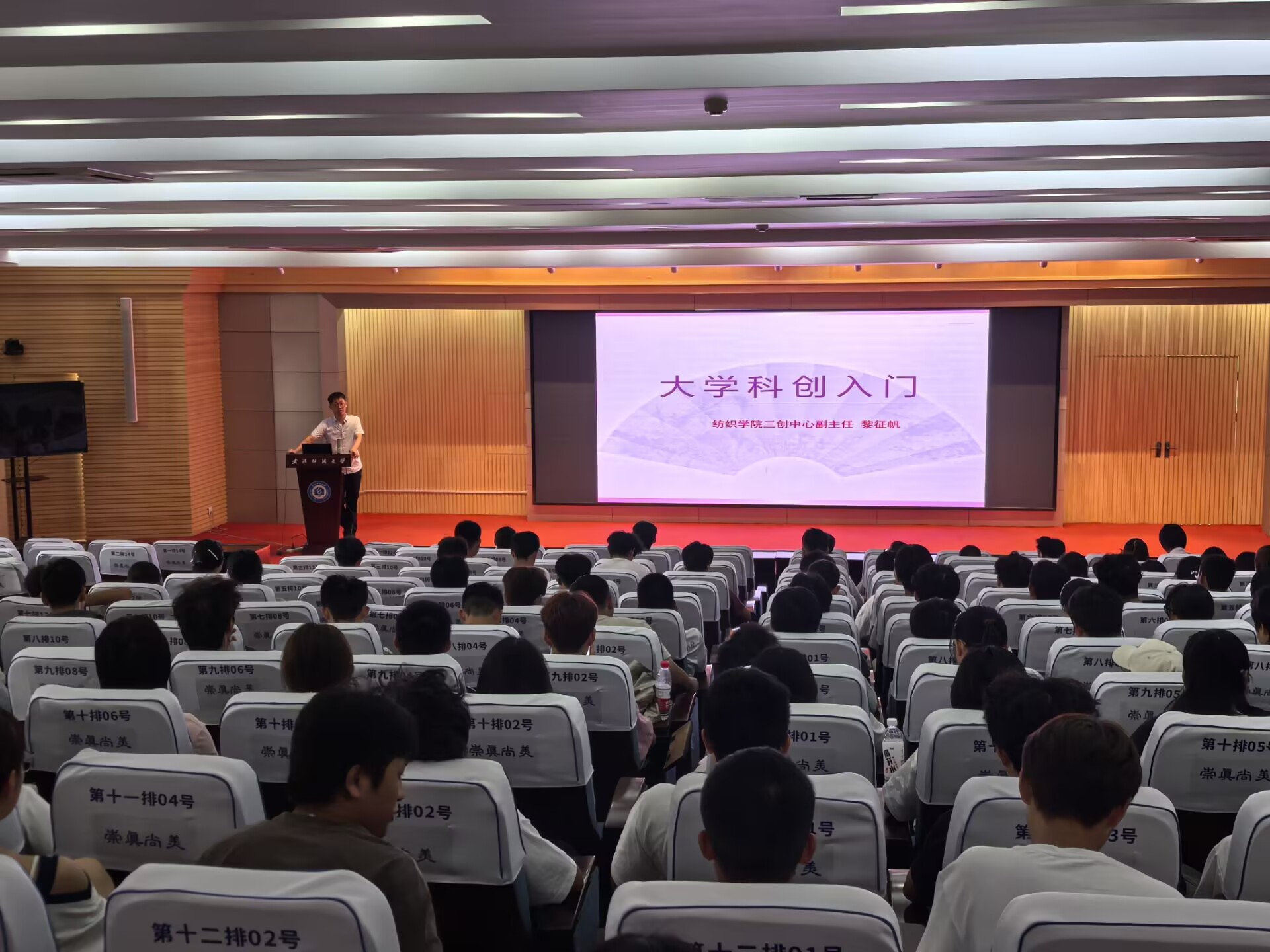 黎征帆老师以“大学科创入门”为题,为新生介绍了公司科创工作体系,并阐述了纺织学子在数字时代的应为与可为。结合具体“挑战杯”、“互联网+”等竞赛的经验,他从信息获取、实验入门、赛事筹备、导师选择等多个方面展开分享,并鼓励大一新生在专注学业的同时,踊跃参与课外实践,实现学术交流、技能拓展与兴趣培养的全方面发展。
