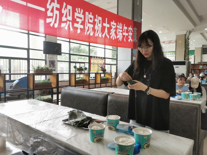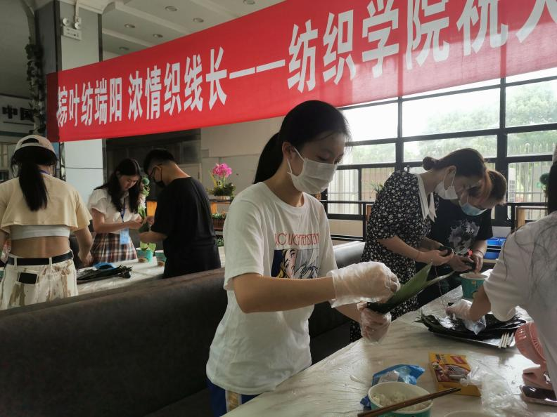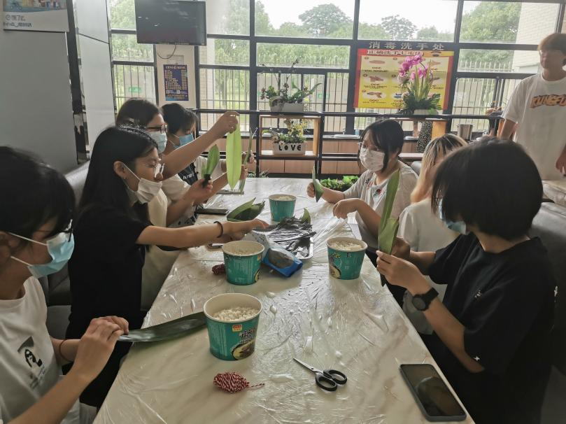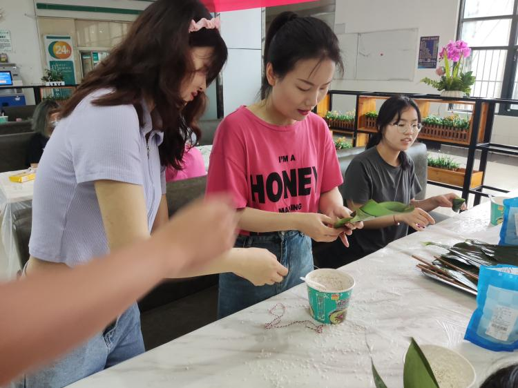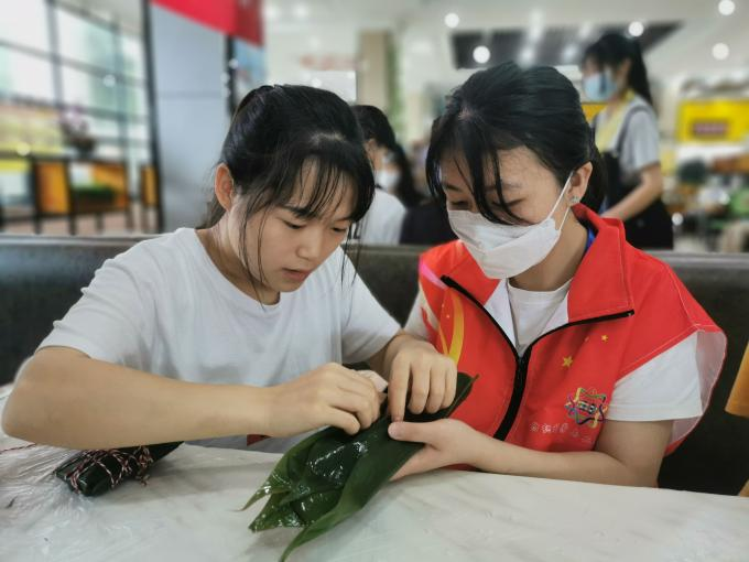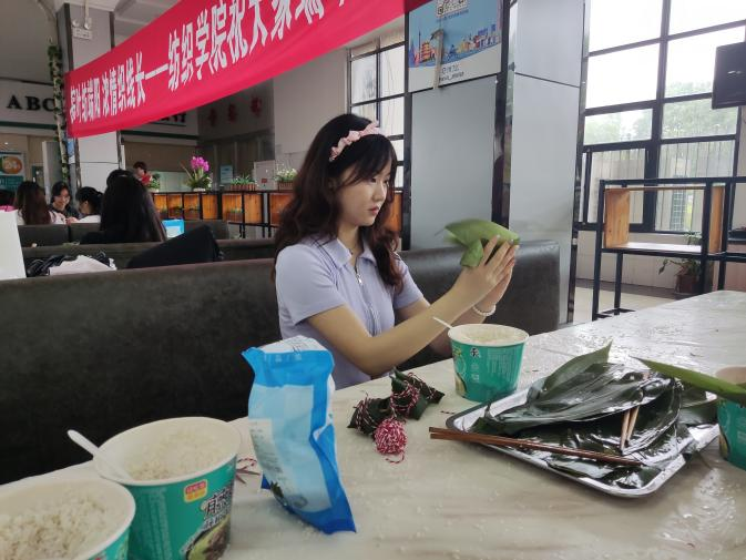 (院团委张竣青老师和同学们一起动手包粽子)