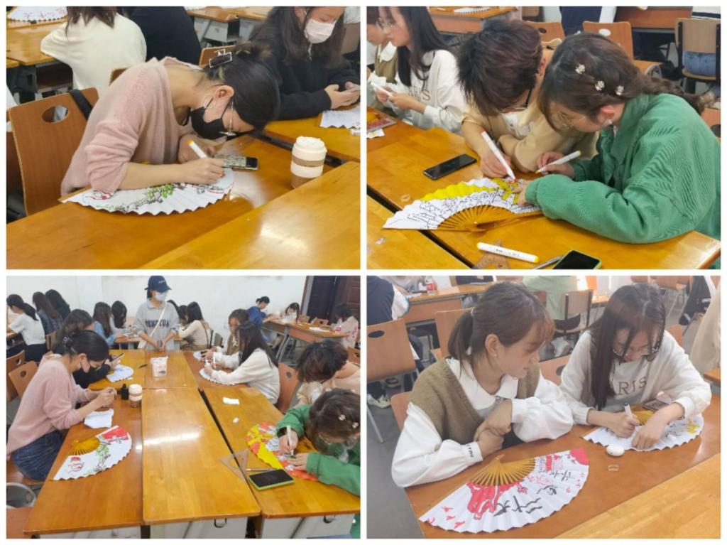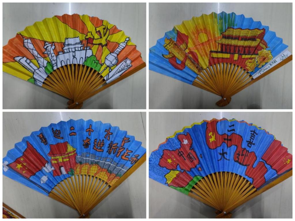 活动伊始,公司给同学们分发空白扇子以及绘图工具,同学们拿到工具后,教室里充满了激烈的讨论声,大家共同讨论扇面的布局以及配色。在讨论后,同学们兴趣盎然,纷纷拿起毛笔,在折扇上挥毫泼墨,仔细描摹,起笔,落笔,或浓墨重彩,或轻描淡写,一笔一画间包含同学们对中国传统文化的热爱,对党的深情祝福。经过同学们用心绘制下,一幅幅充满诗意雅趣、唯美精致、古色古香的扇面就制作完成了。随后老师们也共同讨论员工作品,同学们热情地展示自己的作品并交流自己制作时的心得与体会。活动最后,老师们与同学们共同合影留念,记录这精彩的活动。