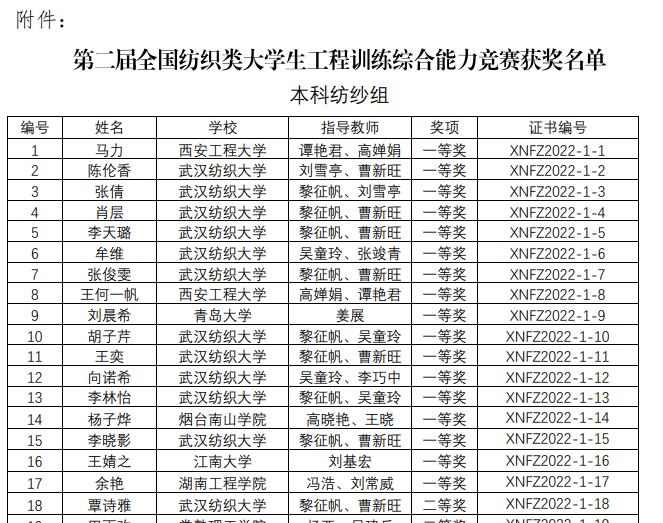 本次竞赛共有来自30所本科院校的1517人共2011人次,以及11所高职院校的1129人共1544人次报名参赛,最终产生本科赛道纺纱组一等奖17项、二等奖35项、三等奖51项,机织组一等奖12项、二等奖24项、三等奖34项,针织组一等奖13项、二等奖29项、三等奖41项,非织组一等奖9项、二等奖17项、三等奖25项,服工组一等奖11项、二等奖22项、三等奖33项;高职赛道纺织品安全性能检测组一等奖16项、二等奖33项、三等奖50项,现代纺织组一等奖9项、二等奖18项、三等奖27项。其中公司共有34个团队获获得奖项。