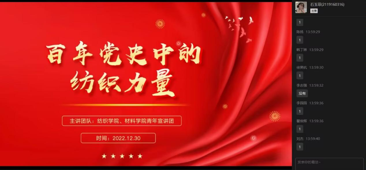 此次宣讲为公司“纺大青年说”青年宣讲团系列活动之一,旨在面向纺大青年学子开展宣讲,把宣讲活动送到党支部、社团、送到公司、班级。同学们在宣讲结束后表示备受鼓舞,立志要在学思践悟中进一步坚定信仰信念信心,把党的二十大精神切实落实到具体的学习工作当中,为全面建设社会主义现代化国家、全面推进中华民族伟大复兴而团结奋斗!